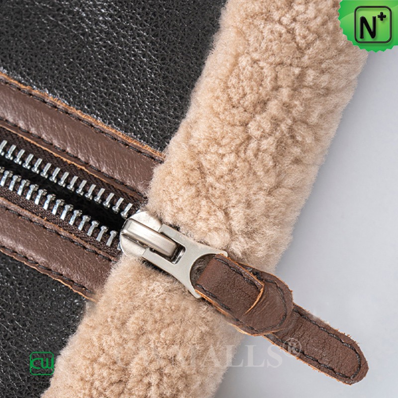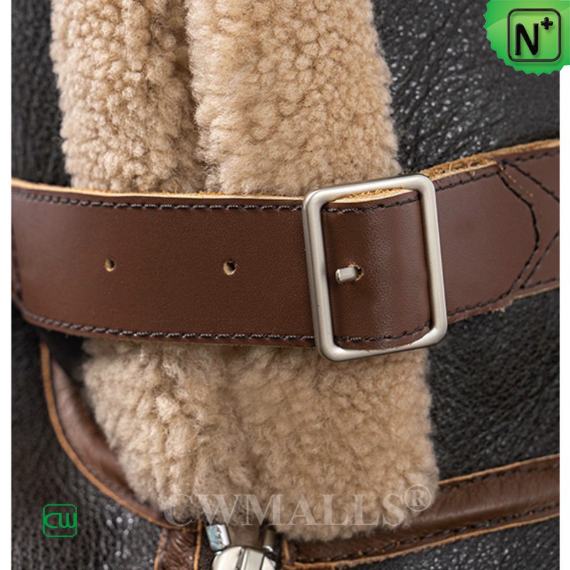 CWMALLS women's shearling bomber jacket crafted premium, warm, plush shearling sheepskin, fashioned with a front zip closure, a buckle strap at collar, roll-back shearling cuffs, two side pockets, and exposed shearling bottom. A front zipper lends this sheepskin jacket its revved-up attitude, while all-natural shearling provides sumptuous softness and warmth.